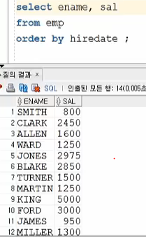 잘 조회되었는지 확인해보려면 SELECT에 hiredate라는 칼럼을 추가 후 다시 조회해도 값이 똑같은 순서로