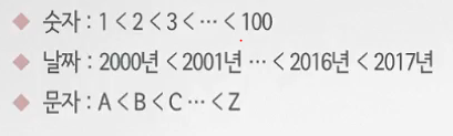 - 숫자 값은 작은 값부터, 날짜 값은 과거 값부터, (과거 -> 미래), 문자 값은 영문자 순으로 표시됨