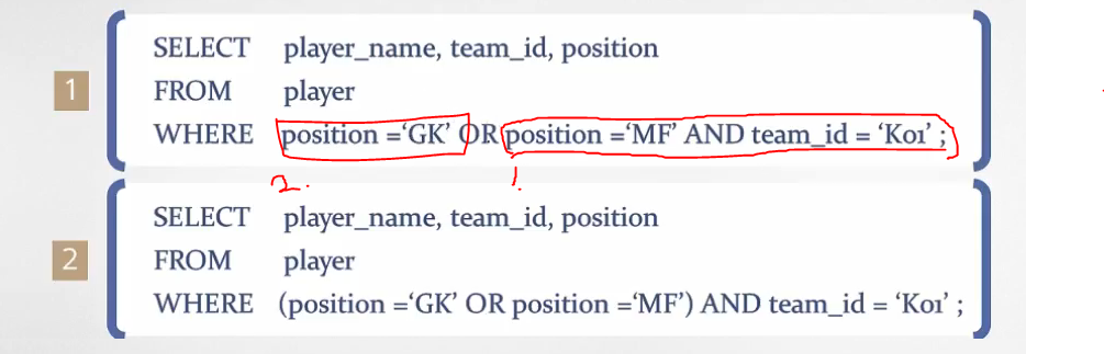 - WHERE 절에 AND, OR, 연산자를 조합해서 사용하는 경우에는 AND부터 처리하고 OR조건을 처리함