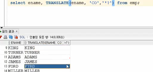 | TRANSLATE(s, from to) | 첫 문자는 탐색집합의 첫 문자로 대체 (2 번째도 동일) |