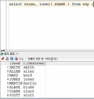 ![]() ENAME칼럼이 모두 소문자로 바뀌여 보이는 것을 확인할 수 있다. |