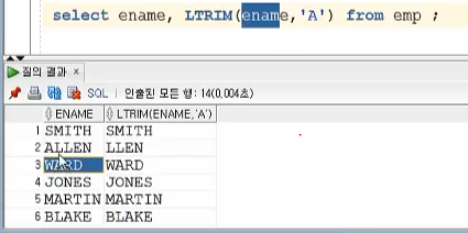 2) LTRIM 왼쪽에 제거하고 싶은 문자가 있을 때 사용해준다.