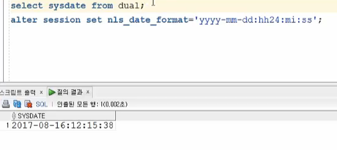 alter session set nls_date_format = 'yyyy-mm-dd:hh24:mi:ss'; (sql Developer은 해당 명령을 통해 바꿔 줄수 있다.) (yyyy: 년, mm: 월, dd:일, hh: 시간 24는 24시간으로 표시하겠다. ss: 초 ) |