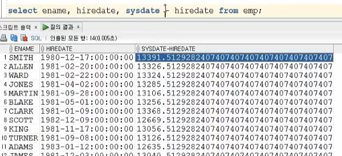 - 날짜형 데이터 간 뺄셈을 수행 할 수 있음