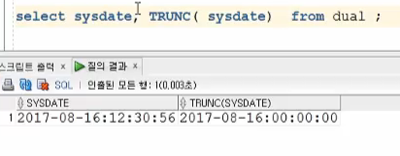 뒤에 시분초만 초기화해서 쓰고 싶을때 날짜함수에 Trunc 함수 사용 하여 초기화되어 사용 할 수 있습니다.