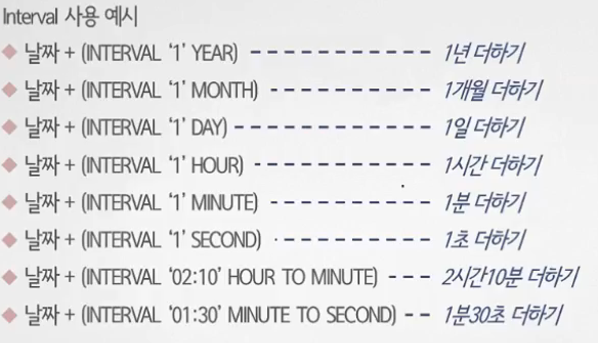 | DATE + NUMBER | 날짜에 해당 일수를 더한 날짜를 리턴 |